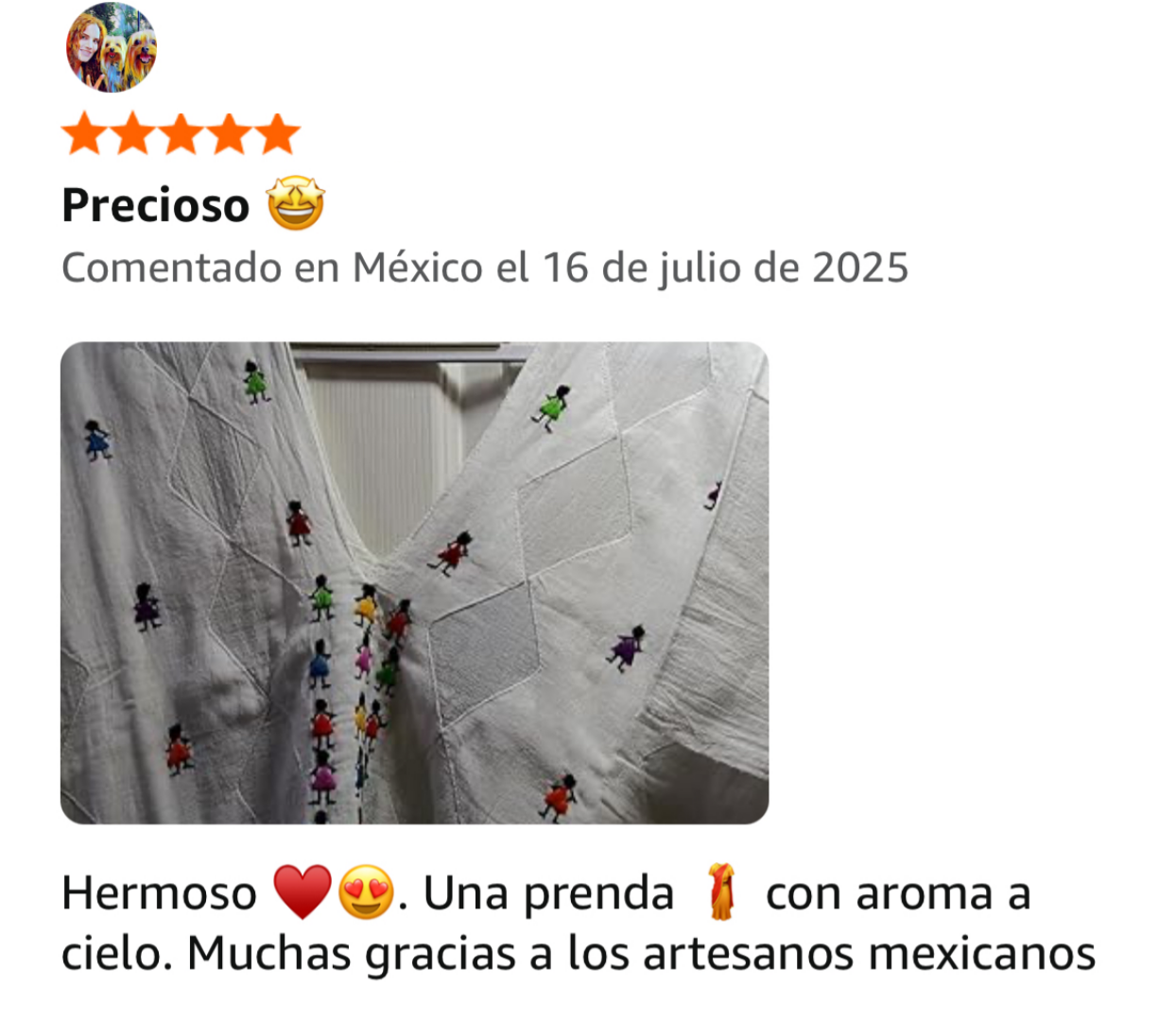 "Me encantó la ropa que pedí, de muy buena calidad las telas pero lo que se lleva las palmas de oro son los bordados perfectos e increíbles, excelentes artesanas, seguiré comprando"