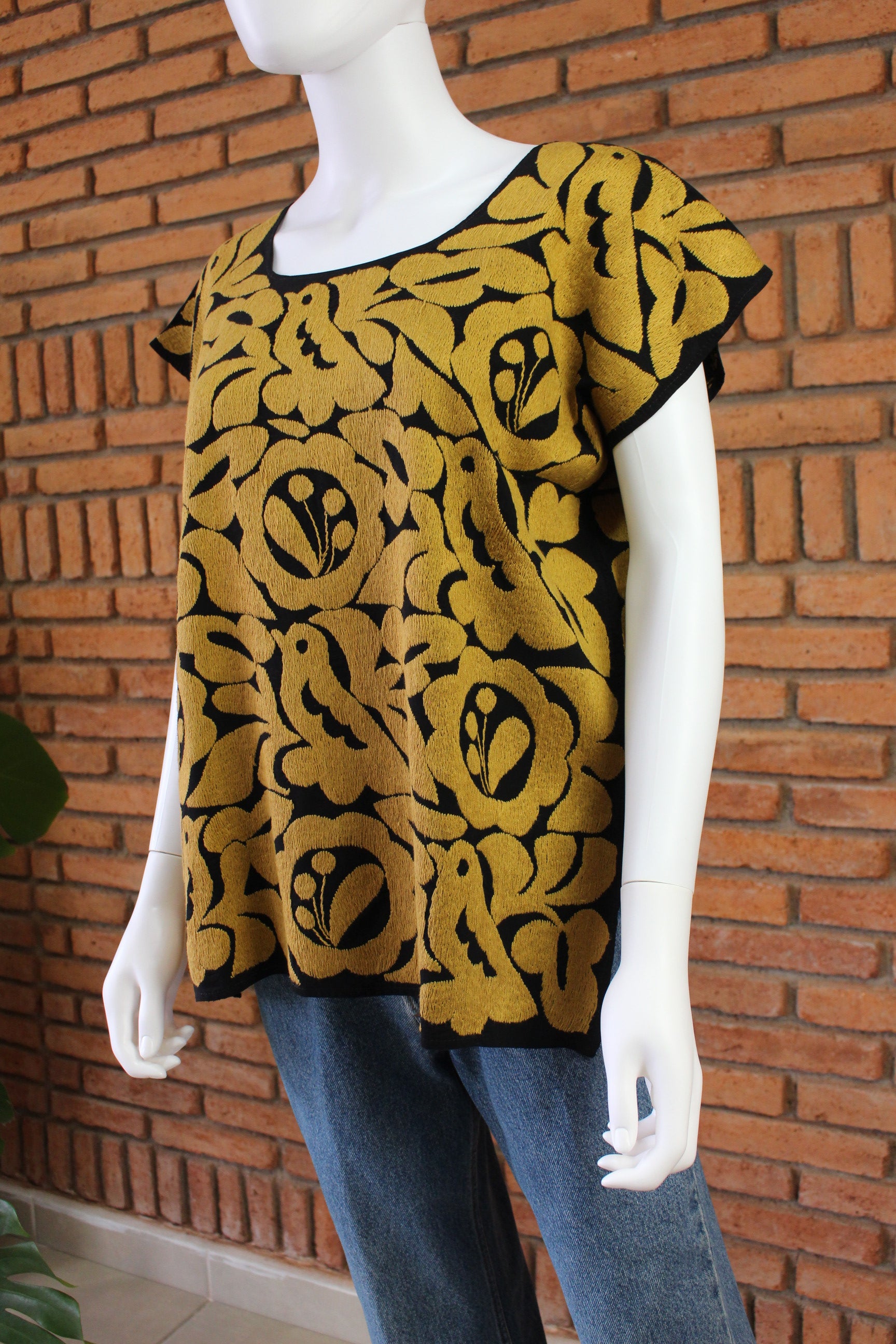 Blusa Bordada a Mano Negro con Mostaza Mod. Jalapa Unitalla.
