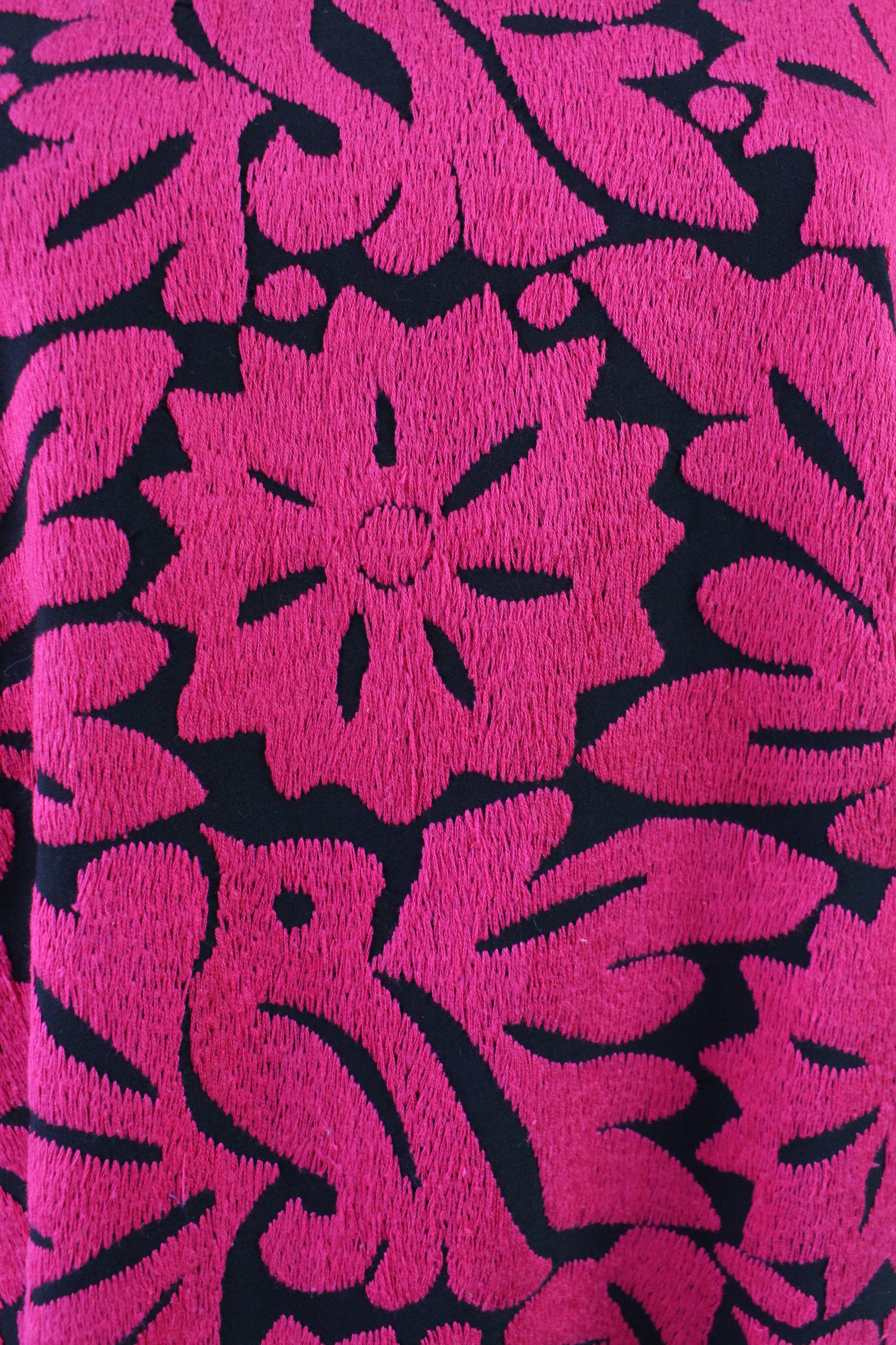 Hermosa prenda bordada en Tela Rayón Negro con bordado de hilos Multicolor 100% algodón, hecha por las manos de las artesanas de Jalapa de Díaz Oaxaca.
