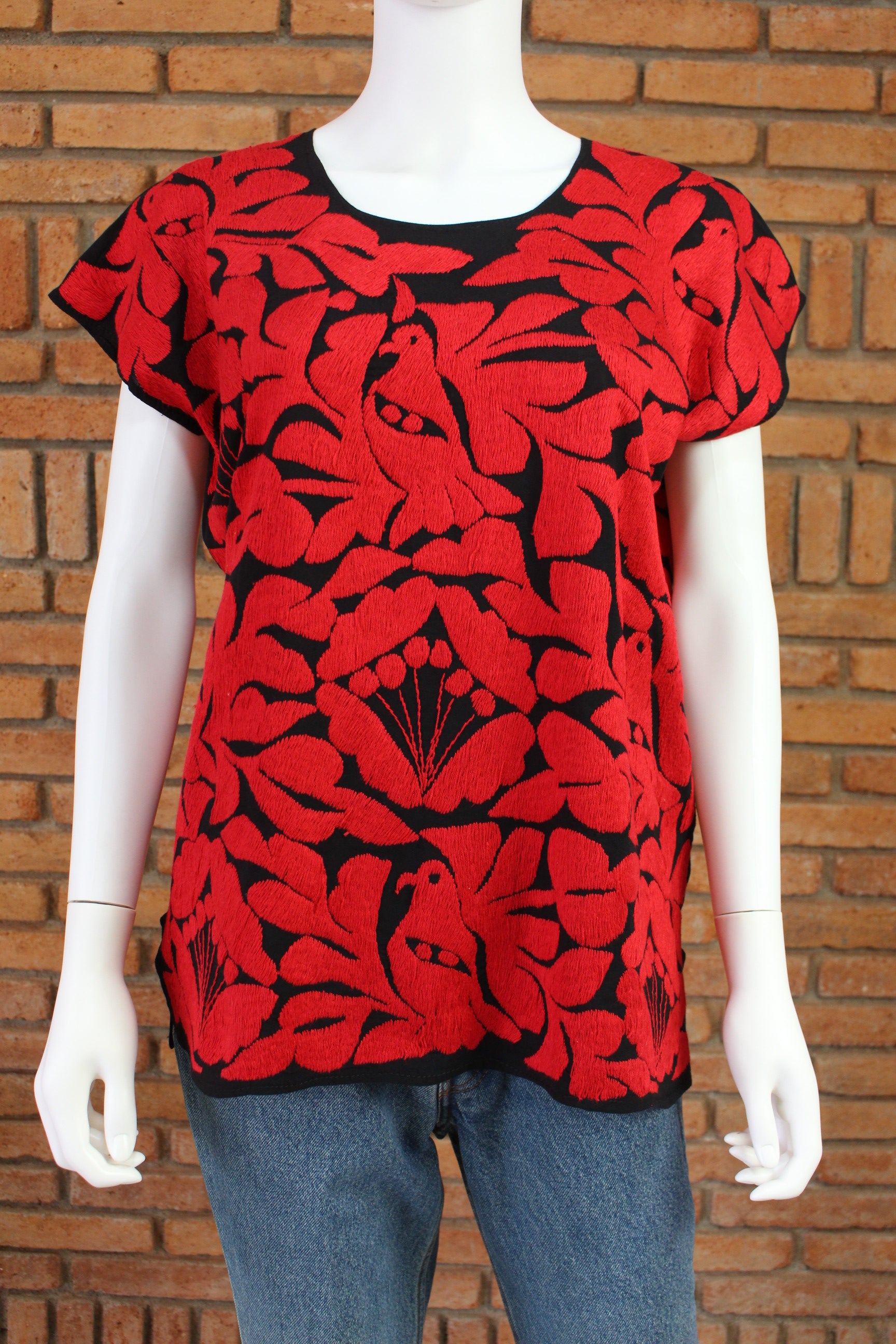Blusa Bordada a Mano Negro con Rojo Mod. Jalapa Unitalla.