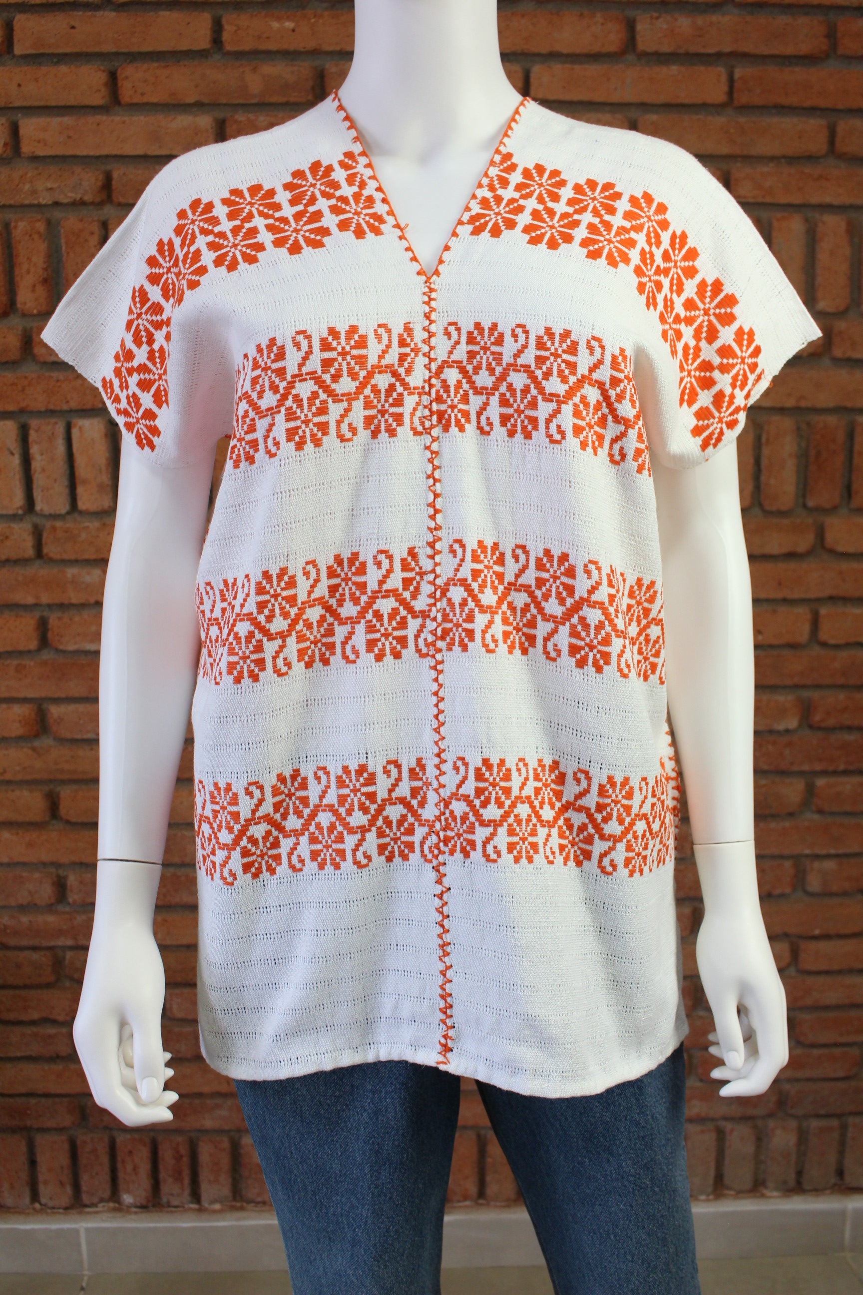 Blusa Hecha a Mano Blanco con Naranja Mod. Mixe 2 Lienzos Unitalla.