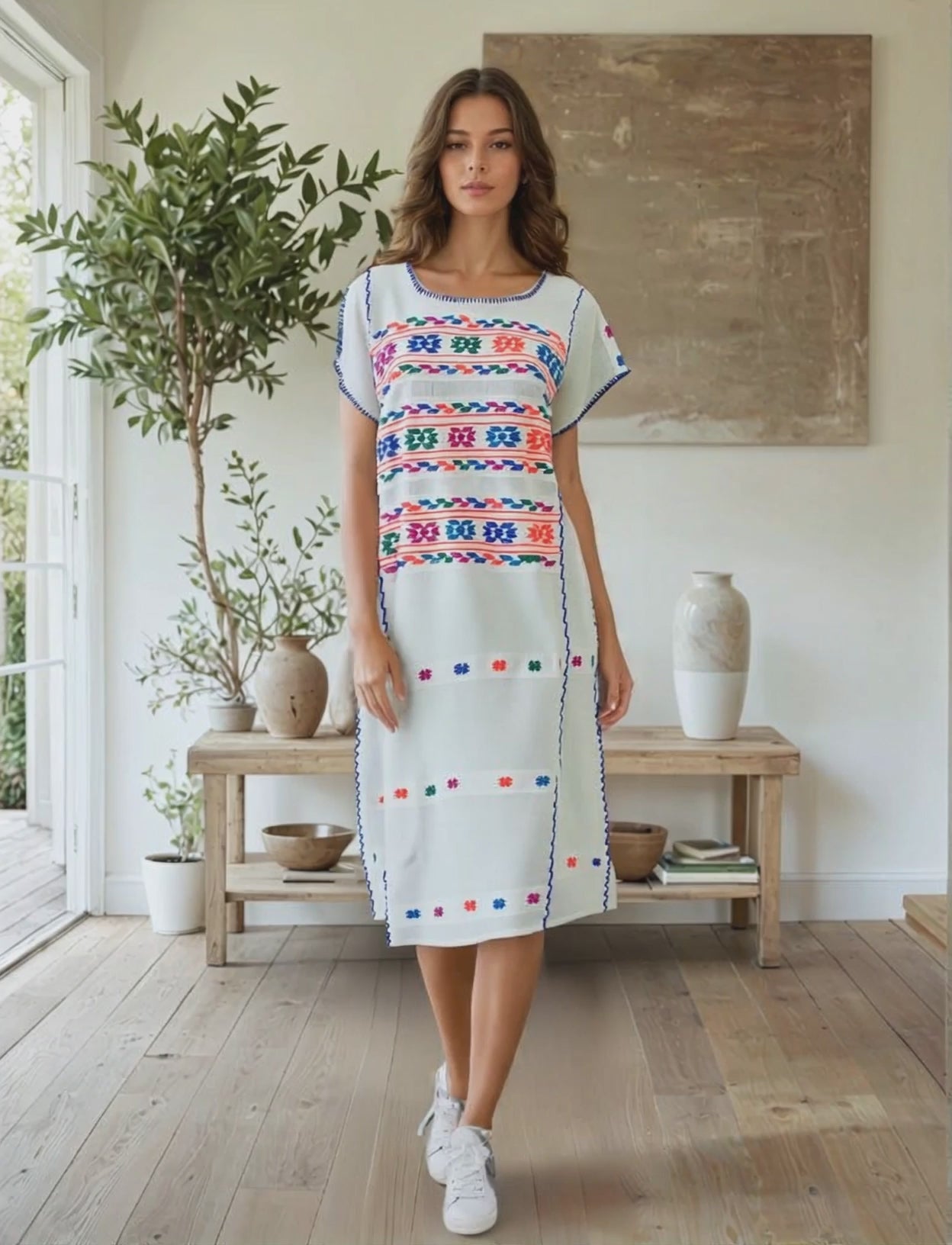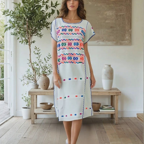 Hermoso Vestido Amuzgo hecho en telar de cintura con hilos 100% algodón, base color beige con brocado multicolor, todas las uniones son tejidas a mano con hilos de diferentes colores, hecho en la región de la costa Oaxaqueña manteniendo una actividad que se ha transmitido de generación en generación.