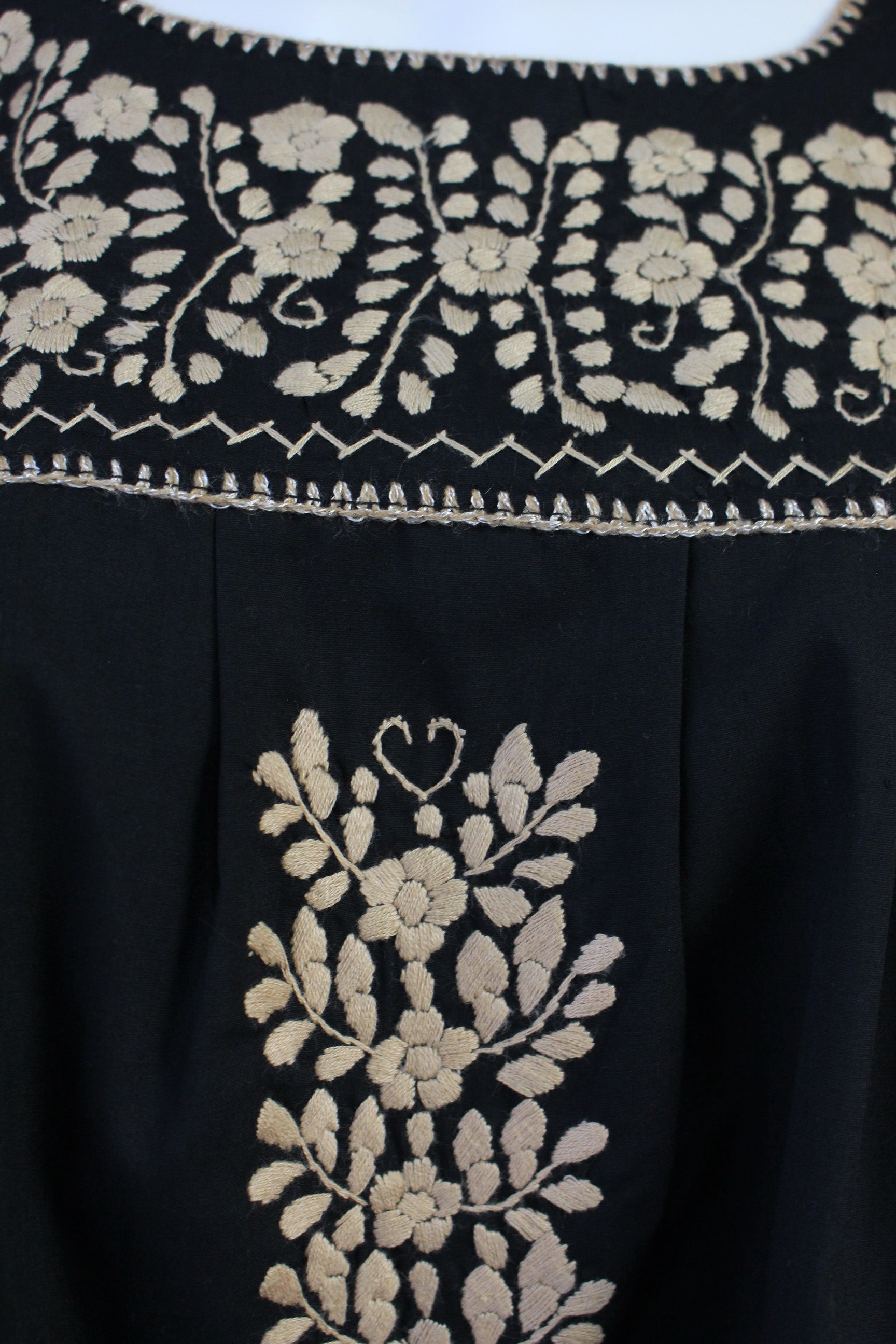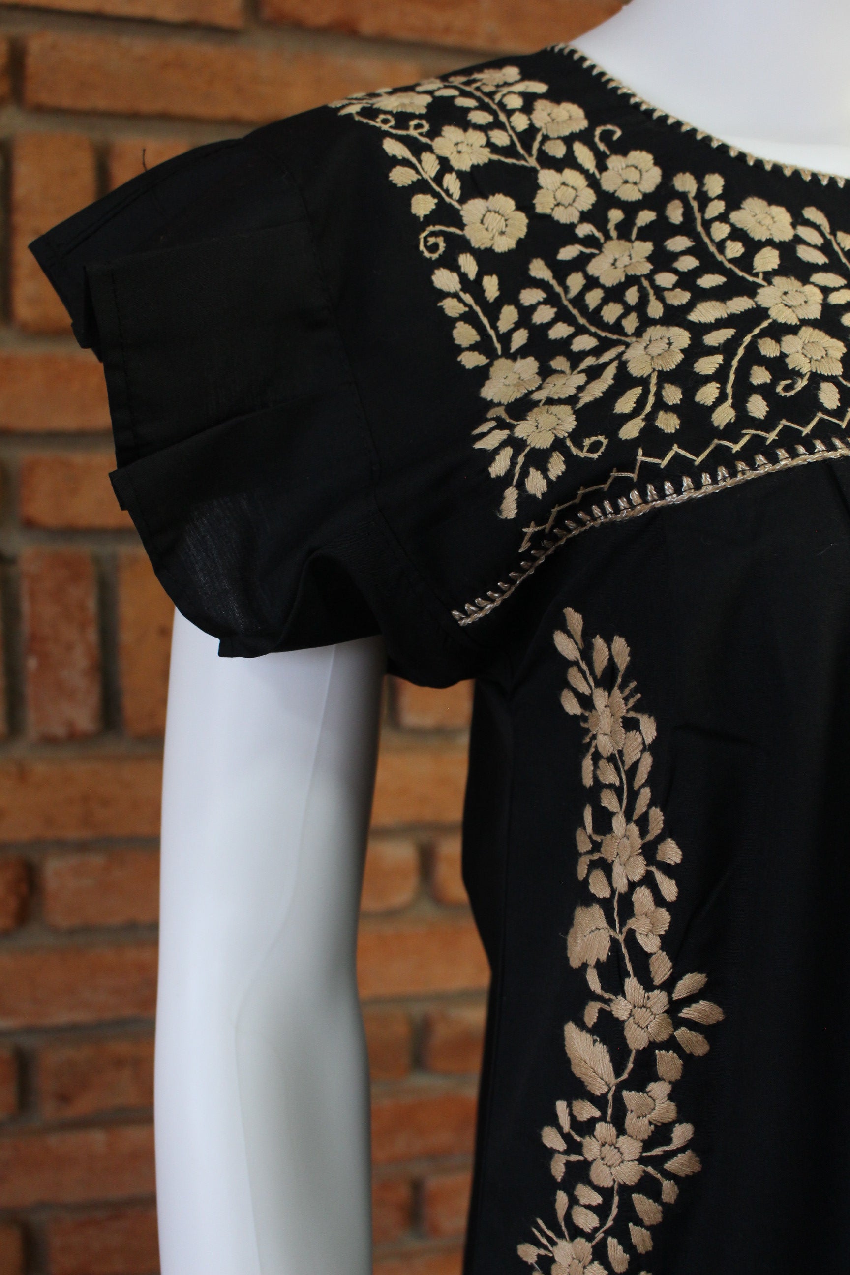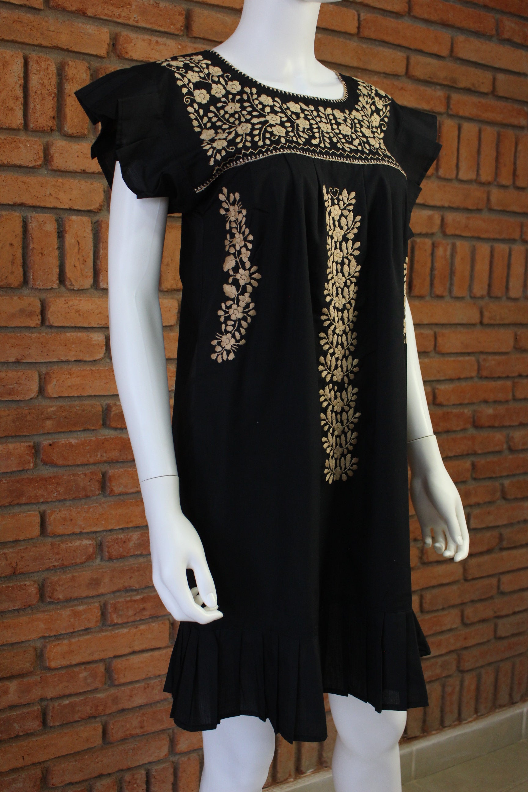 Hermoso vestido con olanes en las mangas y en la parte de abajo. Bordado a Mano en tela de popelina 50% algodón 50% poliéster con bordado multicolor, hechos por las manos de las mujeres artesanas de la región de la Mixteca Alta.